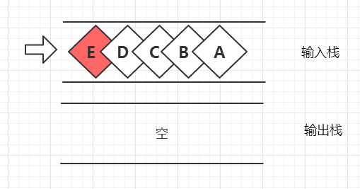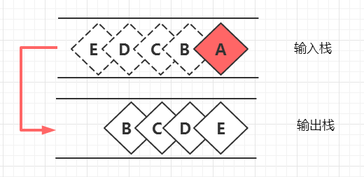 2.出队列操作: 判断当输出栈为空时,先把输入栈的数据依次弹出并加入到输出栈中