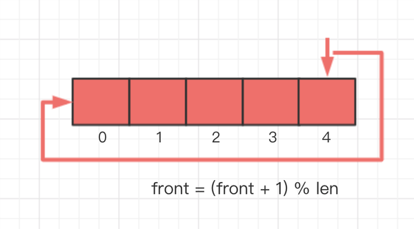 怎么实现从尾部到头部的循环呢? 我们可以通过取余运算符实现,因为当 i = 数组长度- 1的时候,(i + 1) % 数组长度 = 0,也就是说这个时候指针又从尾部回到了数组的头部