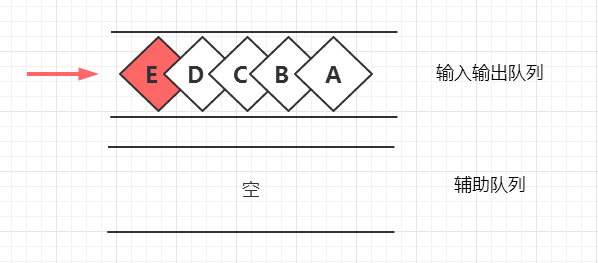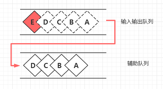 一个元素入队列了,我们接下来希望这个队列像栈一样通过pop把它直接弹出来,但是前面还有很多个元素排着队呢,这时我们想,只要把前面排队的所有元素先出列到另外一个辅助队列里面去,接下来不就可以直接把这个元素踢出队列从而模拟出栈了吗?