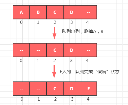 对于普通的单向队列,在入队列和出队列的时候可能会遇到一种“队列假满”的现象,导致空间的浪费如下图所示
