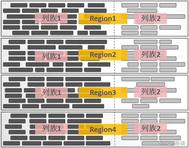 也可以这么理解:将HBase中拥有数亿行的一个大表,横向切割成一个个"子表",这一个个"子表"就是Region: