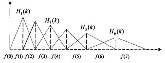 在计算机中,线性坐标到梅尔坐标的变换,通常使用带通滤波器来实现,一般常用的使用三角带通滤波器,使用三角带通滤波器有两个主要作用:对频谱进行平滑化,并消除谐波的作用,突显原先语音的共振峰。其中三角带通滤波器构造的示意图如下所示:
