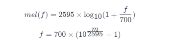 人耳能听到的频率范围是20-20000Hz,但人耳对Hz这种标度单位并不是线性感知关系。例如如果我们适应了1000Hz的音调,如果把音调频率提高到2000Hz,我们的耳朵只能觉察到频率提高了一点点,根本察觉不到频率提高了一倍。因此可以将普通的频率标度转化为梅尔频率标度,使其更符合人们的听觉感知,这种映射关系如下式所示: