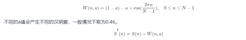 通常我们使用汉明窗进行加窗,将分帧后的每一帧乘以汉明窗,以增加帧左端和右端的连续性。假设分帧后的信号为 S(n), n=0,1,…,N-1, NS(n),n=0,1,…,N−1,N 为帧的大小,那么乘上汉明窗后: