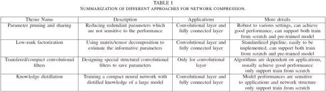 在表 1 中,我们简单地总结了这四种方法。通常参数修剪和分享、低秩分解和知识精炼方法可以通过全连接层和卷积层用于 DNN,它们能实现有竞争力的性能。另外,使用迁移/压缩滤波器的方法只适用于全卷积神经网络。低秩分解和迁移/压缩滤波器的方法提供了一种端到端的流程,并且它们很容易直接在 CPU/GPU 环境中实现。而参数修剪和共享使用了不同的方法,如向量量化、二进制编码和系数约束以执行这些任务,通常他们需要花一些处理步骤才能达到最终的目标。
