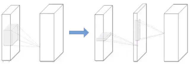 图 2. CNN 模型压缩的低秩近似(Low-rank approximation)。左:原始卷积层。右:使用秩 K 进行低秩约束的卷积层。