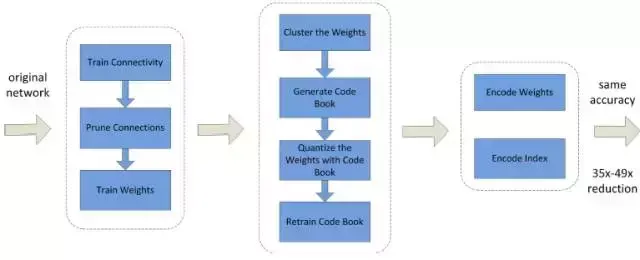 [10] 提出的方法是首先修剪不重要的连接,重新训练稀疏连接的网络。然后使用权重共享量化连接的权重,再对量化后的权重和码本(codebook)使用霍夫曼编码,以进一步降低压缩率。如图 1 所示,该方法首先通过正常的网络训练来学习连接,然后再修剪权重较小的连接,最后重新训练网络来学习剩余稀疏连接的最终权重。
