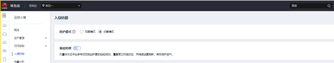 在华为云CFW控制台,入侵防御->防御策略设置页面,打开基础防御功能开关,并启动拦截模式。