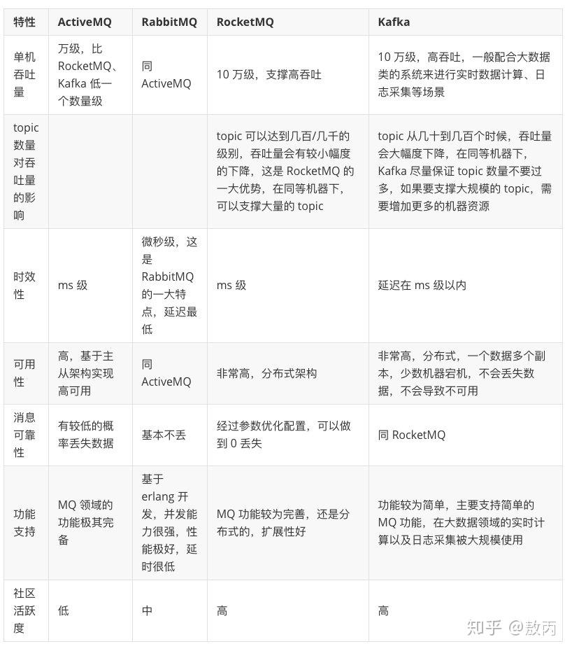 不过敖丙我想说的是,ActiveMQ和RabbitMQ这两着因为吞吐量还有GitHub的社区活跃度的原因,在各大互联网公司都已经基本上绝迹了,业务体量一般的公司会是有在用的,但是越来越多的公司更青睐RocketMQ这样的消息中间件了。