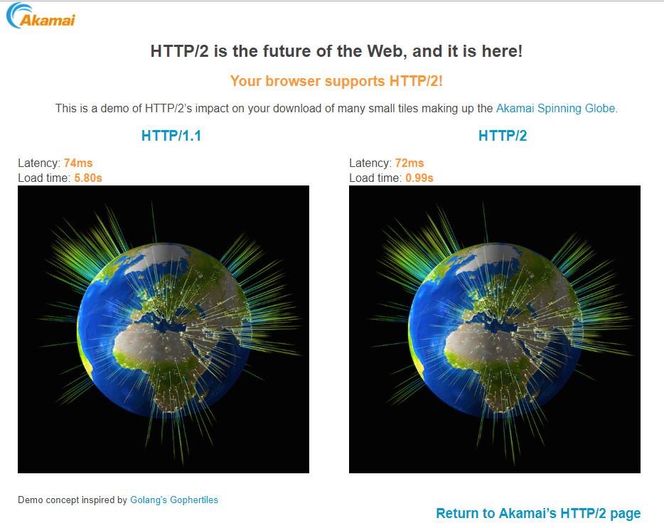 akamai做了http2.0和http1.1在加载过程中的对比效果(实验中加载379个小片段 在笔者的电脑上的加载时间是0.99s VS 5.80s):