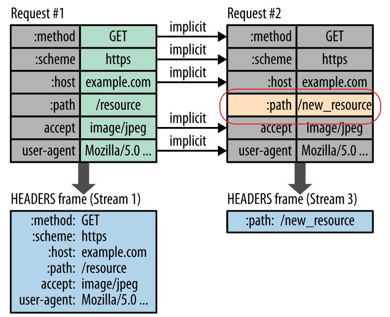 极端情况如果请求头每次没有变化,那么传输中则不包含首部,也就是首部开销就是零字节。如果首部键值对发生变化了,也只需要发送变化的数据,并且将新增或修改的首部帧会被追加到首部表,首部表在链接存活期始终存在, 并且由客户端和服务器共同更新和维护。