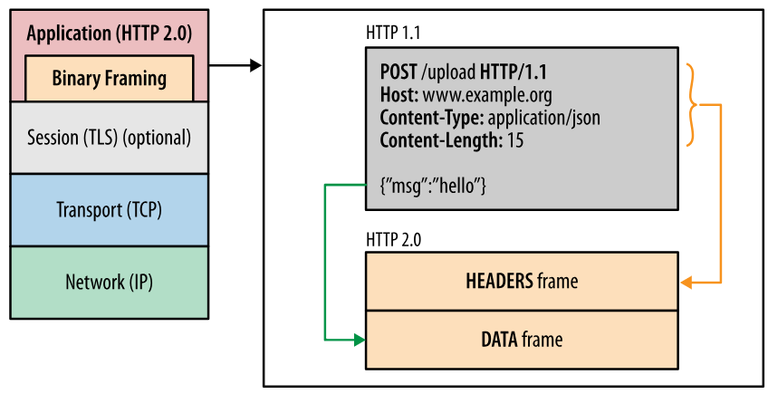 二进制分帧层binary framing layer在不修改请求方法和语义的基础上,重新设计了编码机制,如图为http2.0分层结构(图片来自参考4):