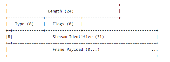 再来看一下HeadersFrame头部帧的结构:从各个域可以看到长度、类型、标志位、流标识符、数据净荷等,感兴趣可以阅读rfc7540相关文档。
