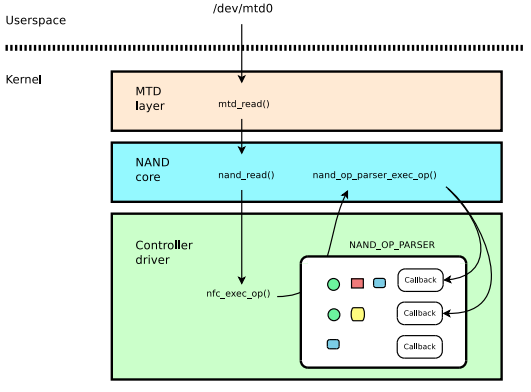 /dev/mtd0是nandflash设备的字符设备驱动节点,上图展示了 read("/dev/mtd0") 的底层实现(MTD layer->NAND core->Controller driver)。