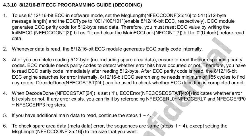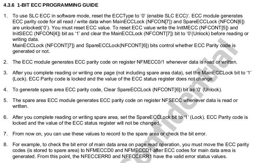 - 从nandflash spare 区域读到的 ecc 校验码应该发送给 nandflash 控制器,nandflash 控制器会帮我们计算好是否有bit 错误,并且将结果和纠错需要用到的信息保存在寄存器中,软件通过寄存器里的信息推导出正确的数据;
