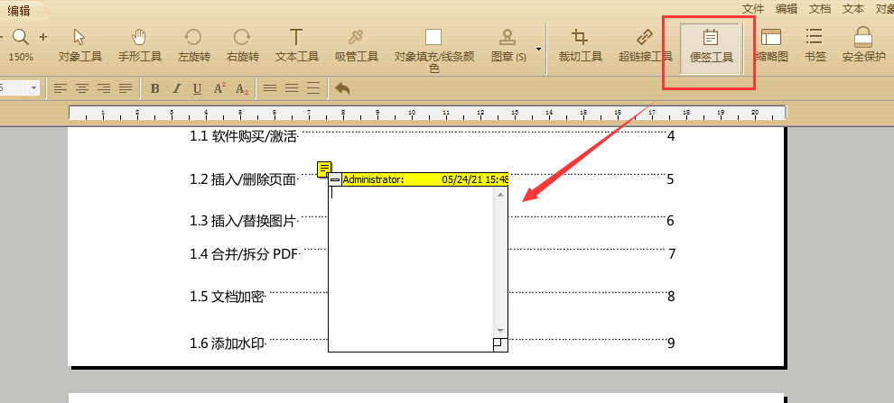 先点击上方菜单栏中的“便签工具”后,鼠标形状变成便利贴状,在需要做批注的文本处单击即可出现浮窗并输入文字。