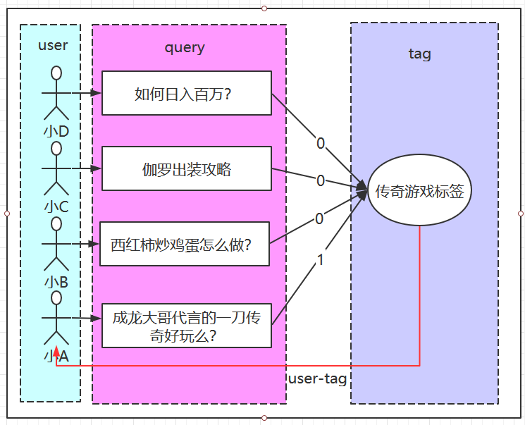 通过这四条搜索,我们人类可以很容易的识别小A的搜索和传奇游戏标签有关,所以我们会给小A打上传奇游戏兴趣标签。而另外三个人则和传奇游戏无关,不会打上传奇游戏的标签。