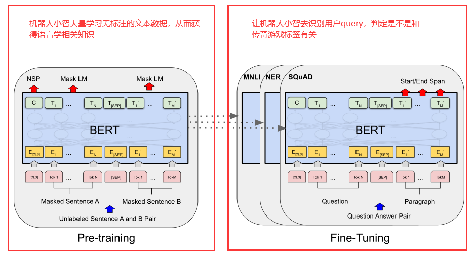 这里和大家明确一个基本概念,BERT是一个预训练+fine tuning的两阶段模型。第一阶段是预训练,通过使用大量的无标注的文本从而学习到一些语言学相关的知识。而第二阶段就直接对接上层应用,你希望完成什么任务它就会不断通过微调的方式变成你想要的样子。