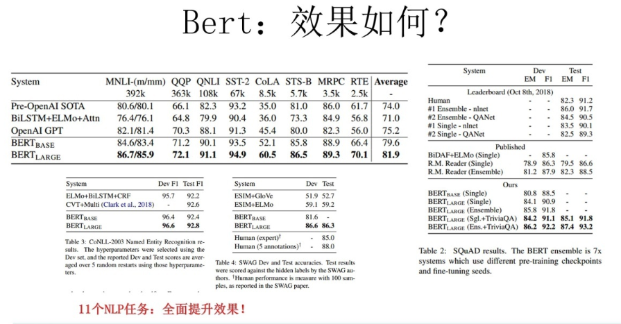 从图1中可以看出BERT在11个NLP任务里面效果有全面的提升:
