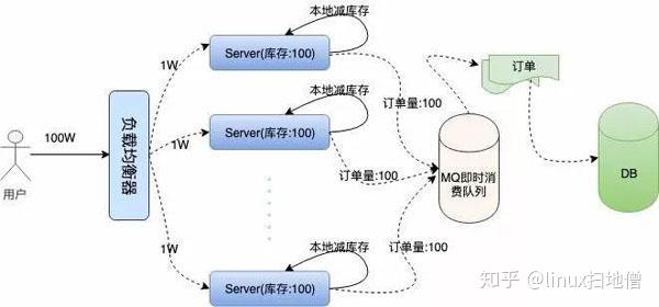 然后我们每台机器本地库存 100 张火车票,100 台服务器上的总库存还是 1 万,这样保证了库存订单不超卖,下面是我们描述的集群架构: