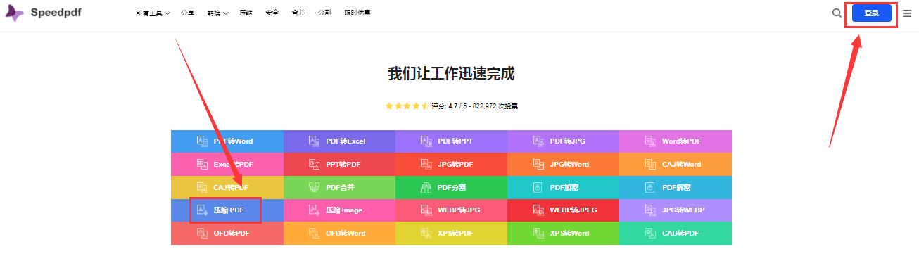 如果是手机中的PDF文档压缩,那PC端的转换器肯定不适用了,我们可以使用在线压缩的方法,无需下载和安装软件。搜索speedpdf打开这个在线工具,与其他在线压缩工具不同的是这个没有文件大小限制,几百兆的文档也能上传并压缩。点击页面右上角的登录授权账号登录后选择压缩PDF;
