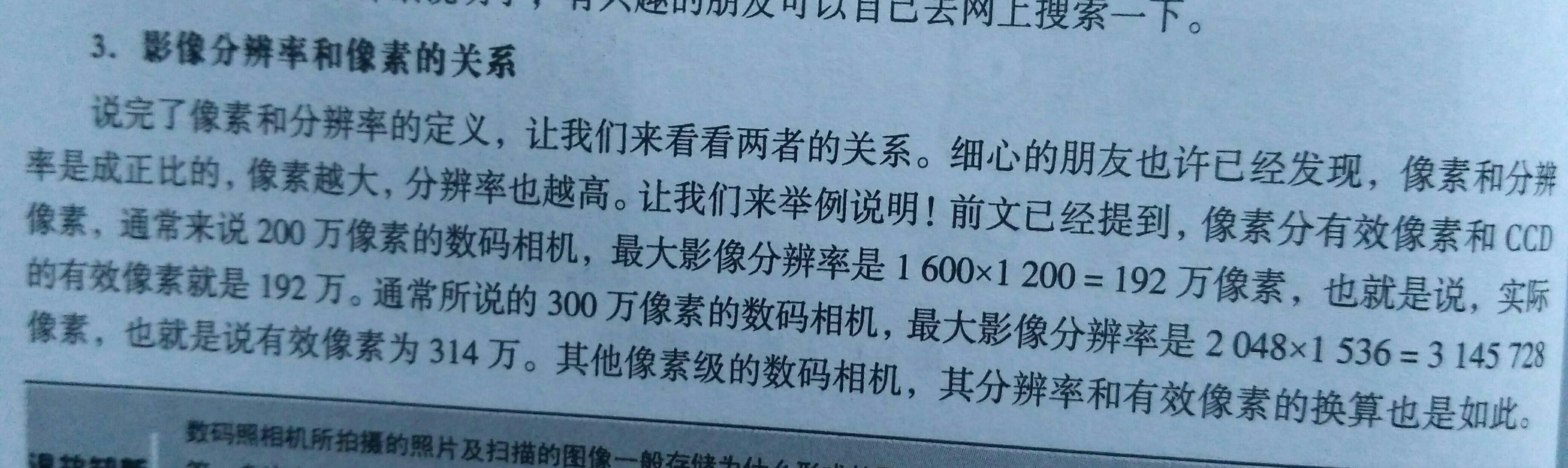 简单的说,我们通常所说的像素,就是CCD/CMOS上光电感应元件的数量。比如说某款CCD在宽方向有2048个像素,在高度方向有1536个像素,2048*1536=3145728,我们就称其为300万像素(因为1M=1048576)。注意,这里的300万像素是CCD像素。像素分为CCD像素和有效像素,现在市场上的数码相机标示的大部分是CCD的像素而不是有效像素。CCD像素是相机所能达到的最大像素,而很多情况下,CCD有一部分并不参与成像的,所以有效像素要低于CCD像素(最大像素)。除此之外,还有镜头像素等其他像素,以后再说。