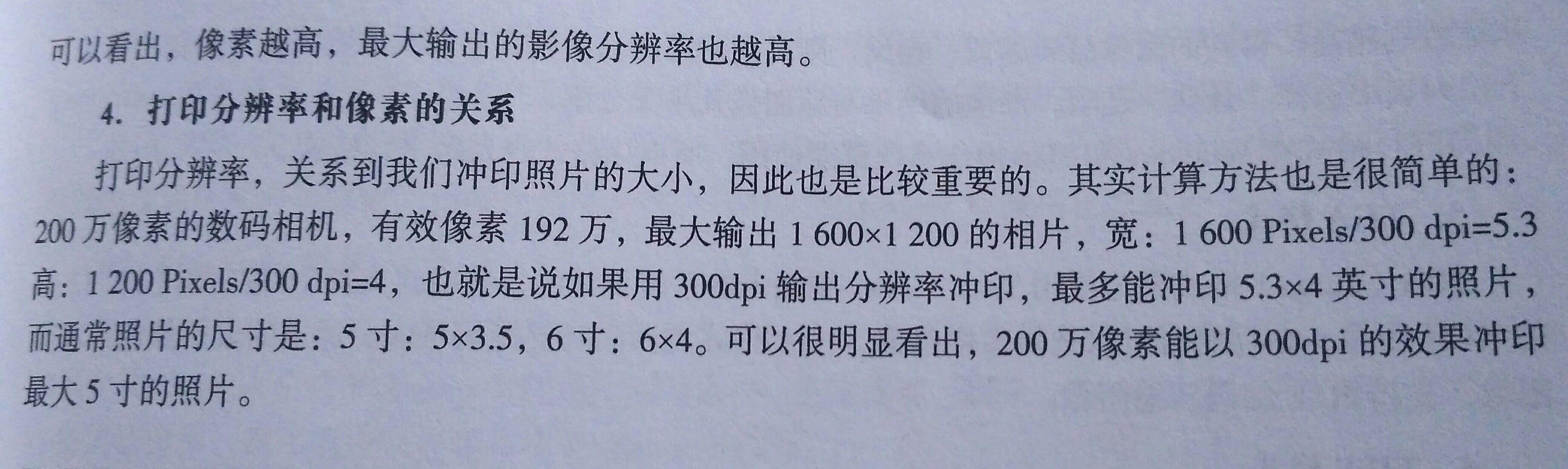 而打印机的扫描精度会更高,比如300dpi,由上面的公式也会得到如果该照片被打印出来,而保持清晰的最大尺寸为 10.32×13.76 ,单位为英寸。