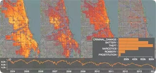 如果要分析千万级以上的时空数据,比如新浪微博上亿用户发文的时间与地理分布(从省到街道多级粒度的探索)时,推荐使用NanoCubes(http://www.nanocubes.net/)。该开源软件可在日常的办公电脑上提供对亿级时空数据的快速展示和多级实时钻取探索分析。上图是对芝加哥犯罪时间地点的分析,网站有更多的实时分析的演示例子。