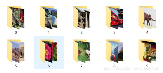 接着将所有各类图像按照对应的类标划分至“0”至“9”命名的文件夹中,如图所示,每个文件夹中均包含了100张图像,对应同一类别。
