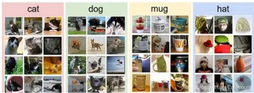 那么,如何编写一个图像分类的算法呢?又怎么从众多图像中识别出猫呢?这里所采取的方法和教育小孩看图识物类似,给出很多图像数据,让模型不断去学习每个类的特征。在训练之前,首先需要对训练集的图像进行分类标注,如图所示,包括cat、dog、mug和hat四类。在实际工程中,可能有成千上万类别的物体,每个类别都会有上百万张图像。