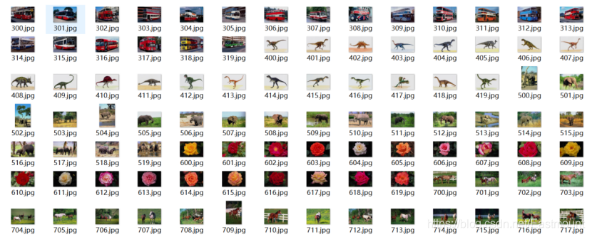 实验所采用的数据集为Sort_1000pics数据集,该数据集包含了1000张图片,总共分为10大类,分别是人(第0类)、沙滩(第1类)、建筑(第2类)、大卡车(第3类)、恐龙(第4类)、大象(第5类)、花朵(第6类)、马(第7类)、山峰(第8类)和食品(第9类),每类100张。如图所示。