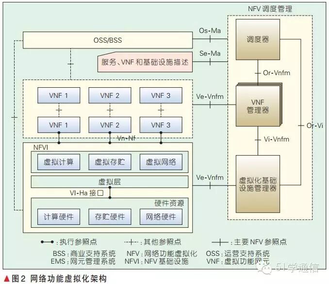 网络功能虚拟化(NFV)架构中包括硬件资源、虚拟资资源、虚拟功能网元、运营支持系统/商业支持系统(OSS/BSS)、虚拟化基础设施管理器(VIM)、VNF管理器(VNFM)、NFV调度器(NFVO)。