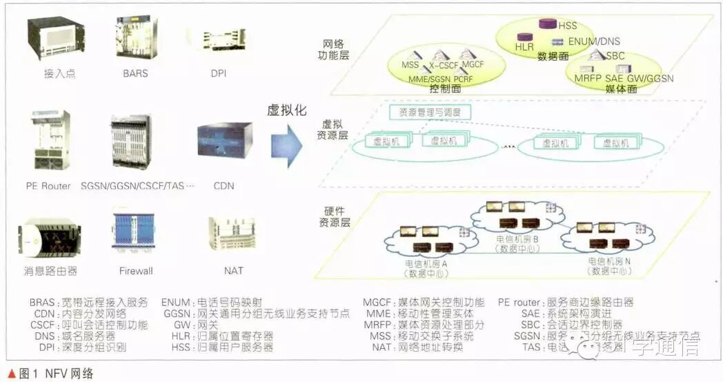 NFV ISG认为电信网络设备,包括软交换、服务通用分组无线业务支持节点(SGSN)、网关通用分组无线业务支持节点(GGSN)、呼叫会话控制功能(CSCF)、归属用户服务器(HSS)、接入设备、防火墙、深度分组识别(DPI)、宽带远程接入服务(BRAS)、PE路由器、内容分发网络(CDN)设备等,可以演进为虚拟功能网元(VNF),部署在通用硬件设备上。整个网络可以分为硬件层、虚拟资源层、网络功能层3层,硬件可以部署在传统电信机房,也可以部署在数据中心,如图1所示。