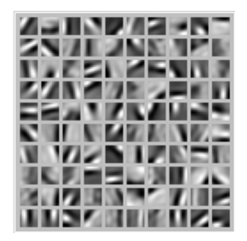得到自编码器后,我们还想进一步了解自编码器到底学到了什么。例如,在10×10的图像上训练一个稀疏自编码器,然后对于每个隐藏神经元,找到什么样的图像可以让隐藏神经元获得最大程度的激励,即这个隐藏神经元学习到了什么样的特征。将100个隐藏神经元的特征都找出来,得到了如下100幅图像: