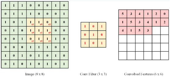 下图揭示了对一幅8×8维图像使用卷积方法提取特征的示意过程。其中使用了3×3的卷积核,走遍图像中每个3×3的位置后,最终得到6×6维的输出图像:
