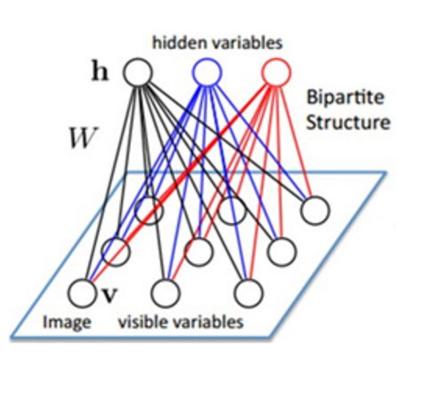 受限玻尔兹曼机(Restricted Boltzmann Machine, RBM)是一个二部图,一层是输入层(v),另一层是隐藏层(h),假设所有节点都是随机二值变量节点,只能取值0或1,同时假设全概率分布p(v, h)满足Boltzmann分布。