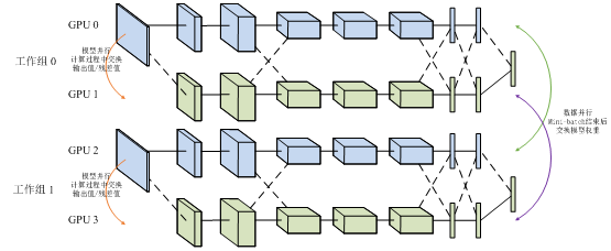 多数情况下,模型并行带来的通信开销和同步消耗超过数据并行,因此加速比也不及数据并行。但对于单机内存无法容纳的大模型来说,模型并行是一个很好的选择。令人遗憾的是,数据并行和模型并行都不能无限扩展。数据并行的训练程序太多时,不得不减小学习率,以保证训练过程的平稳;模型并行的分片太多时,神经元输出值的交换量会急剧增加,效率大幅下降。因此,同时进行模型并行和数据并行也是一种常见的方案。如下图所示,4个GPU分为两组,GPU0,1为一组模型并行,GPU2,3为另一组,每组模型并行在计算过程中交换输出值和残差。两组GPU之间形成数据并行,Mini-batch结束后交换模型权重,考虑到模型的蓝色部分由GPU0和GPU2持有,而黄色部分由GPU1和GPU3持有,因此只有同色的GPU之间需要交换权重。