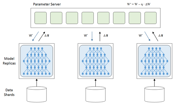要完成数据并行需要做参数交换,通常由一个参数服务器(Parameter Server)来帮助完成。在训练的过程中,多个训练过程相互独立,训练的结果,即模型的变化量ΔW需要汇报给参数服务器,由参数服务器负责更新为最新的模型W’ = W – η ∙ ΔW,然后再将最新的模型W’分发给训练程序,以便从新的起点开始训练。