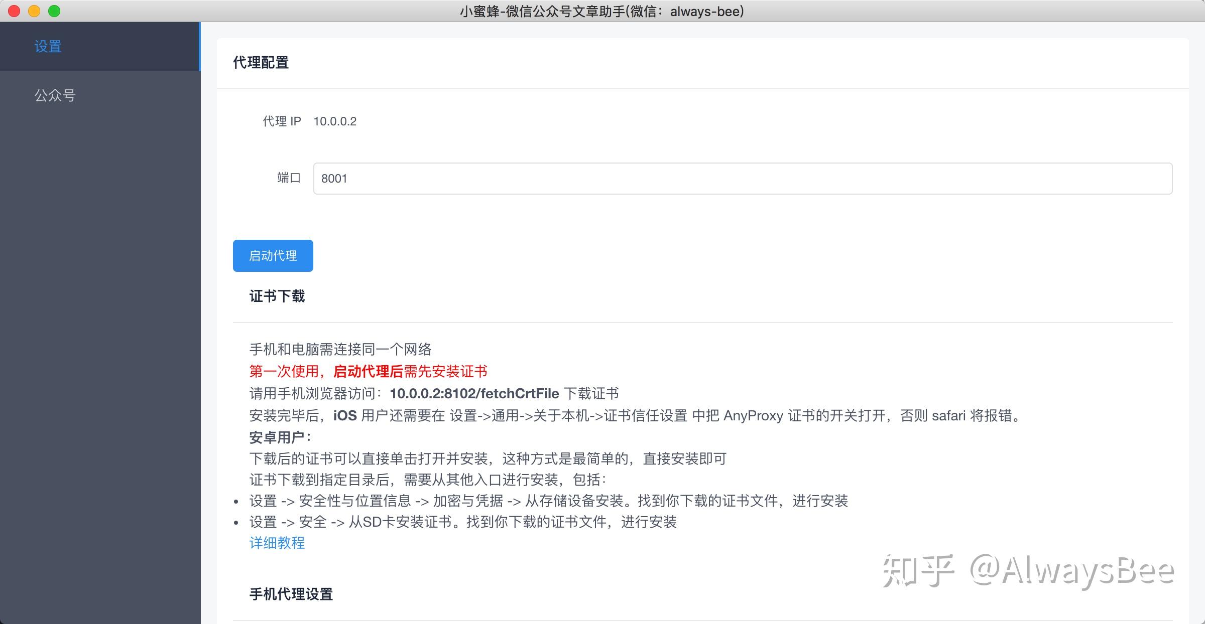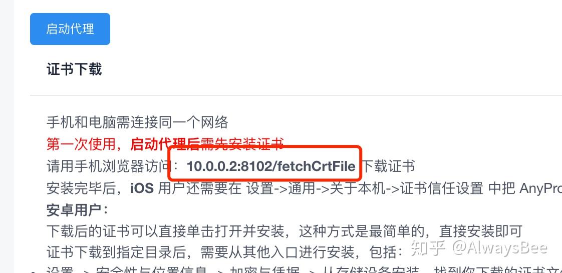 这个时候,我们开始安装 AnyProxy 证书(阿里巴巴提供),注意到下方的证书下载地址( IP 即你本机的 IP 地址,注意后面有一个:符号)