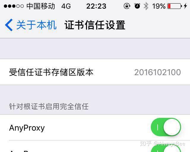 当证书安装完毕之后,iOS 用户还需要信任该证书,前往 设置->通用->关于本机->证书信任设置