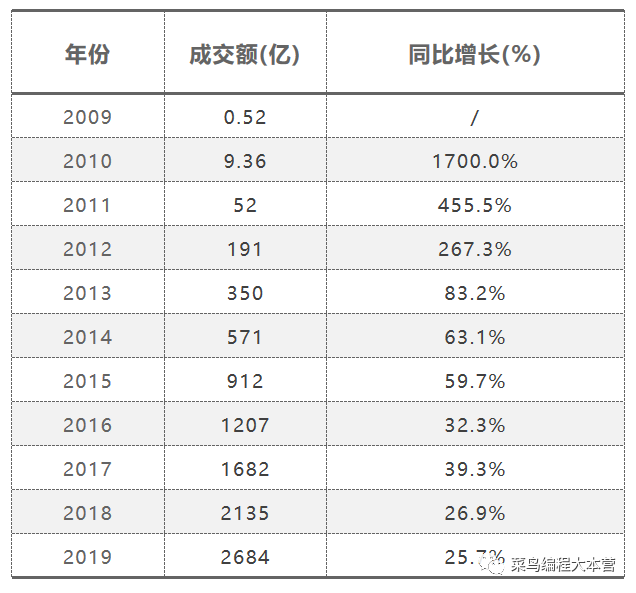 巧媳妇难为无米之炊,要预测价格必须要有历史数据,于是小编从网上找了一些历史的淘宝,天猫的成交金额数据。从2009年以来,双十一淘宝/天猫的成交额就不断的刷新着新的历史记录,下表展示的是从2009年到2019年的十年中,淘宝/天猫的双十一成交额。