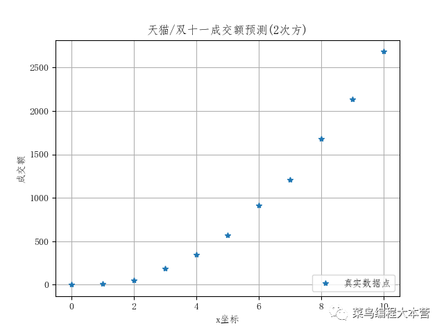 x坐标我们从2009年开始,依次减去2009得到x数值,对于values就是每年的成交额。可以看到,数据呈现一定规律的增长方式,我们首先来进行二次拟合,程序如下所示。