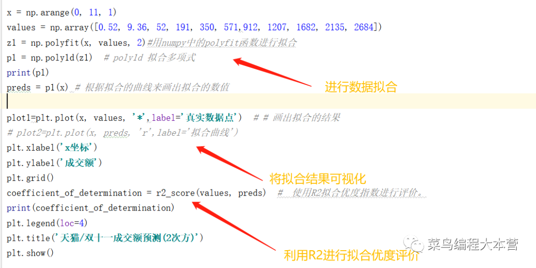 首先,程序中,首先利用polyfit函数来进行拟合,并通过matplotlib库来将拟合结果可视化,最后利用R2进行拟合优度评价。这里的R2大家可以理解为一个指标,其数值一般介于0和1之间,且数值越大说明拟合的效果越好。二次拟合的结果如下: