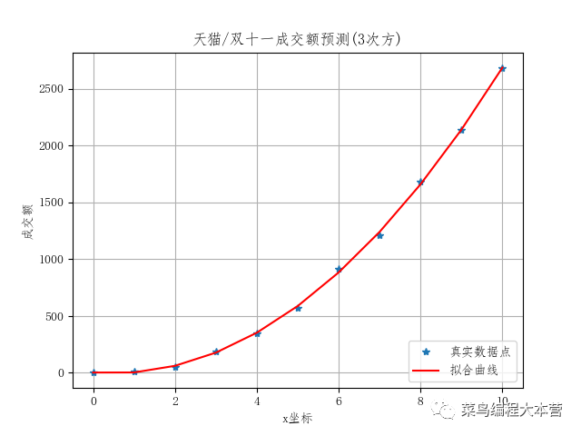 把2020年,也就是x的值为11时带入上式,可以得到,预测的结果约为3281亿。接下来我们再来进行一个三次拟合,来看一下拟合的效果。