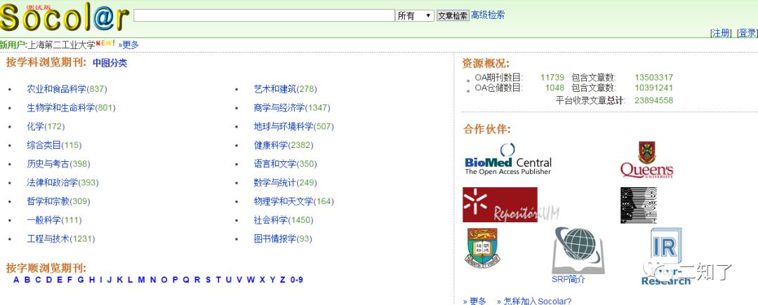 Socolar是一个旨在为用户提供OA资源检索和全文链接服务的公共服务平台,为非赢利性项目。用户在使用Socolar时,可以不用注册。收录了来自世界各地、各种语种的重要OA资源,并优先收录经过学术质量控制的期刊(比如同行评审期刊)。