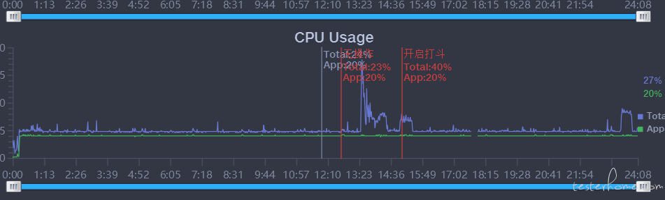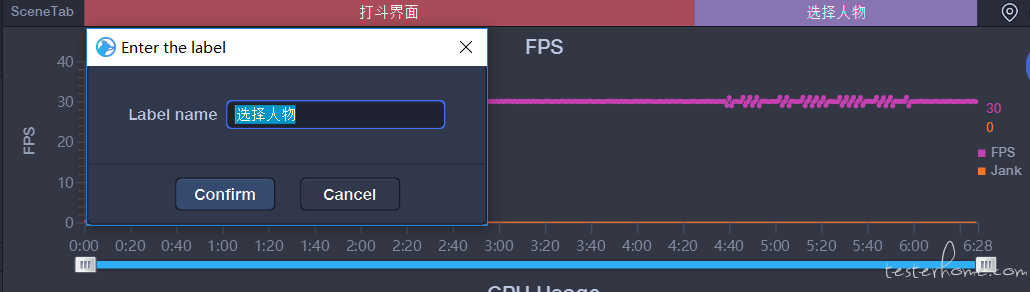 在测试过程中可以针对游戏的不同操作或界面分别设置标签 TAB,通过标签按钮给性能数据打标签,这里我设置了选择角色/游戏打斗两个标签: