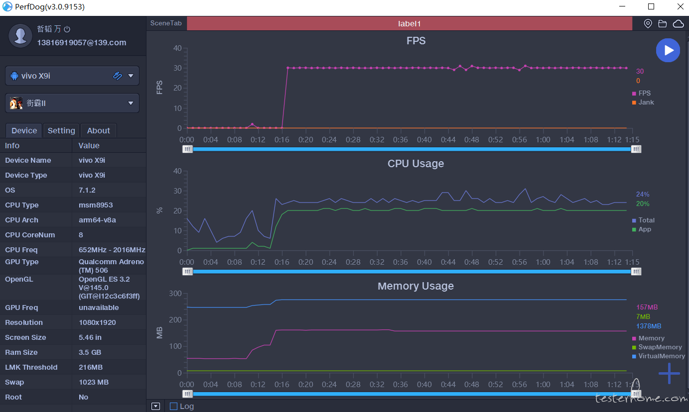 我选择了一款经常玩的游戏进行测试,街霸二,:-),这一看就是典型的 80 后玩的游戏,以前高中翘课逛游戏厅经常玩,每次都要通关,现在因为情怀一直未曾抛弃,看来我不仅怀旧还很专一,臭美下, whatever,继续。开启游戏,我们马上能看到监控数据,PerfDog 默认显示三个指标展示,FPS/CPU Usage/Memory Usage。指标变化采用曲线图的方式展示,其中 CPU Usage 还显示了总共和当前 APP 的消耗对比,数据很全面。