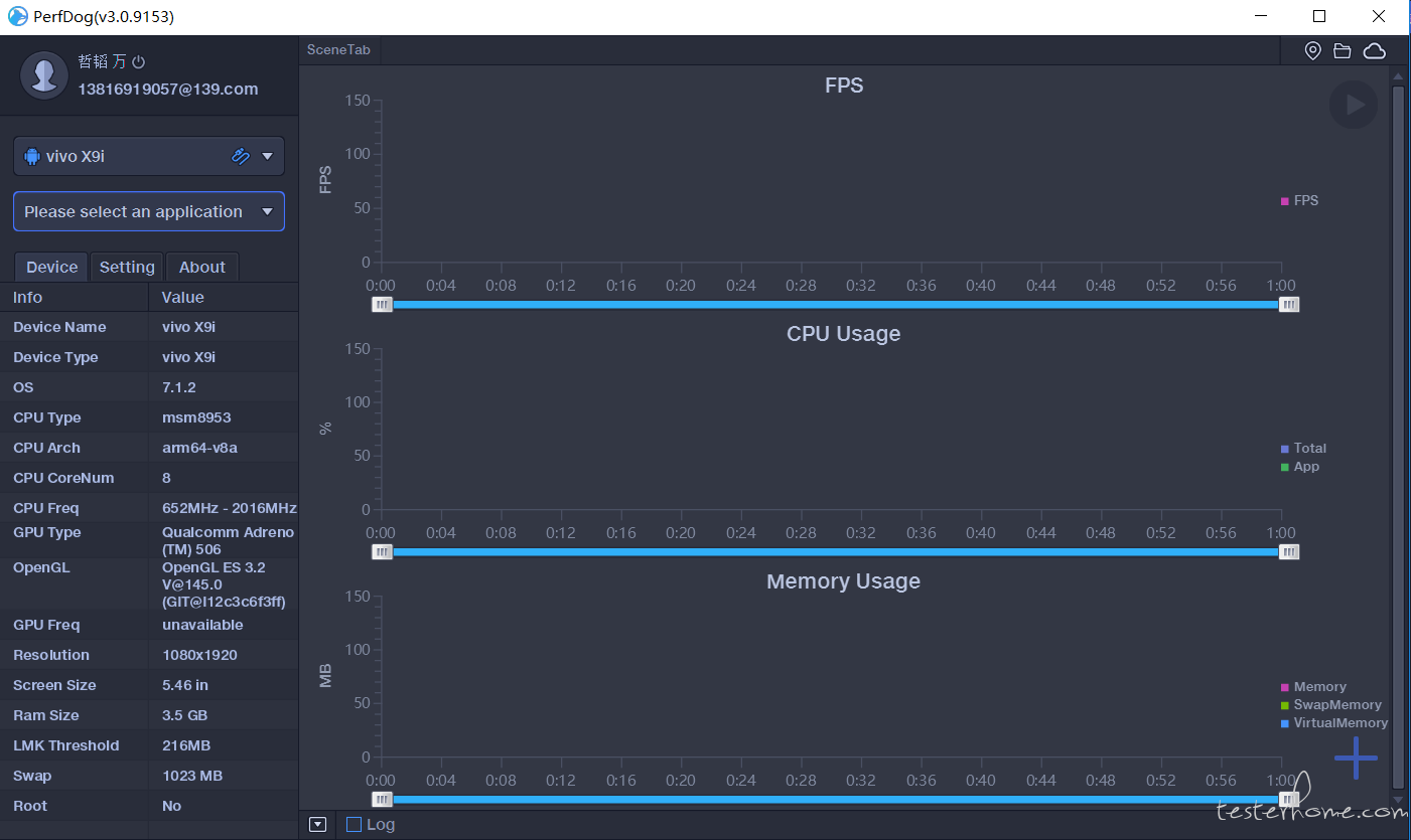 接下来我选取了一个实际的 APP 进行性能测试和监控。打开 PC 端 PerfDog 并通过 USB 连接手机后如图,PerfDog 能立即识别手机型号和各项系统参数: