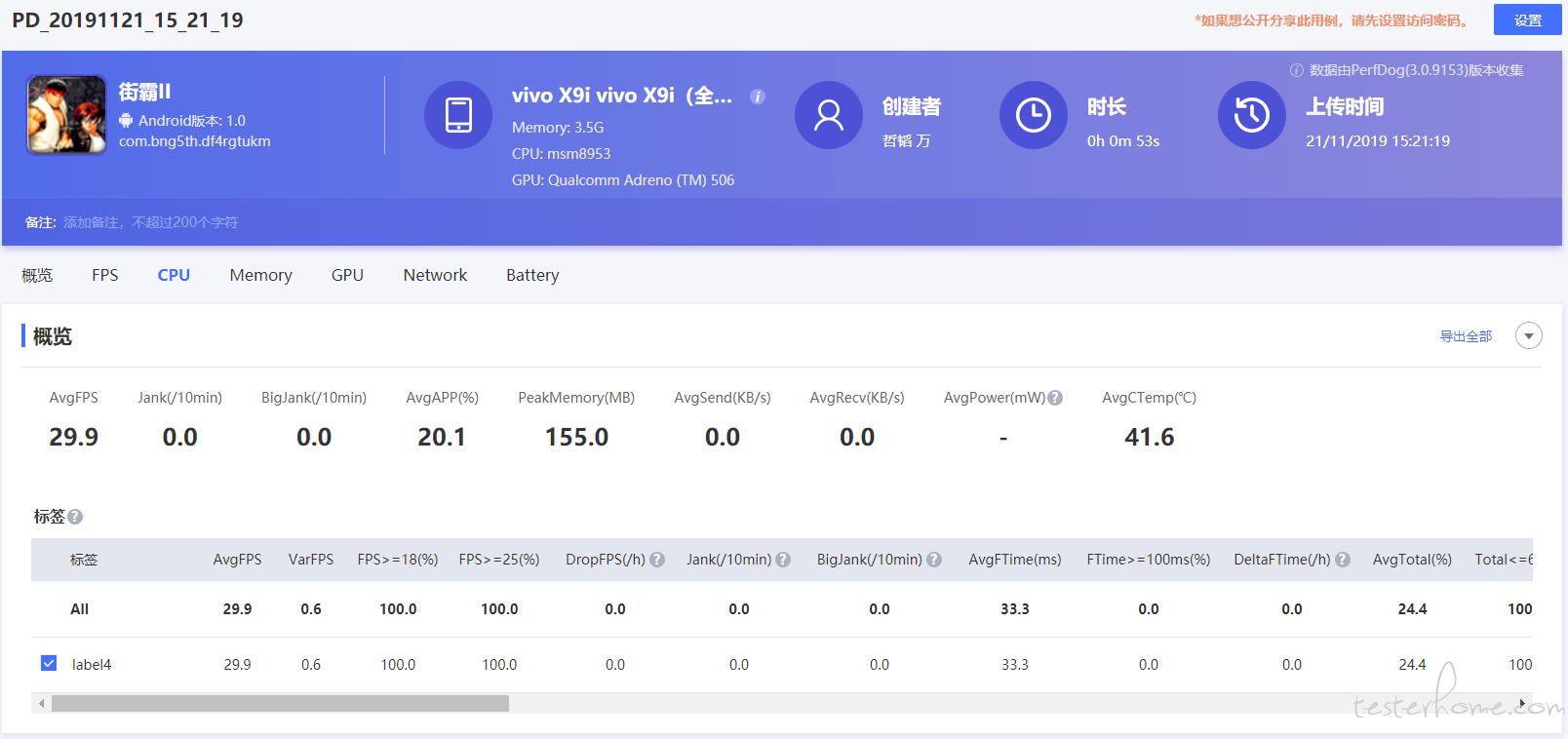 整体评价下来,PerfDog 的性能测试工具自动化和智能化程度都较高、云端数据管理可支撑开发和测试任务协同、测试指标全面、工具性能损耗较小、工具和平台简单易用。只是在对一些预设的场景考虑不足,比如针对压力、响应性能、极限等场景以及针对不同类的 APP 如游戏类、电商类、银行支付类,分别给出行业最佳实践的性能指标参考值,并能进行实时对比分析。还需要根据各类指标监控的数据问题,如 CPU 过高、过热的原因预设置一些处理方案和代码的排查方法,那就 perfect 了。最后总结一句,如果你在做 APP 性能测试,还在使用原始的方法或者其他工具,不妨试用下 PerfDog,一定能对你有所帮助。