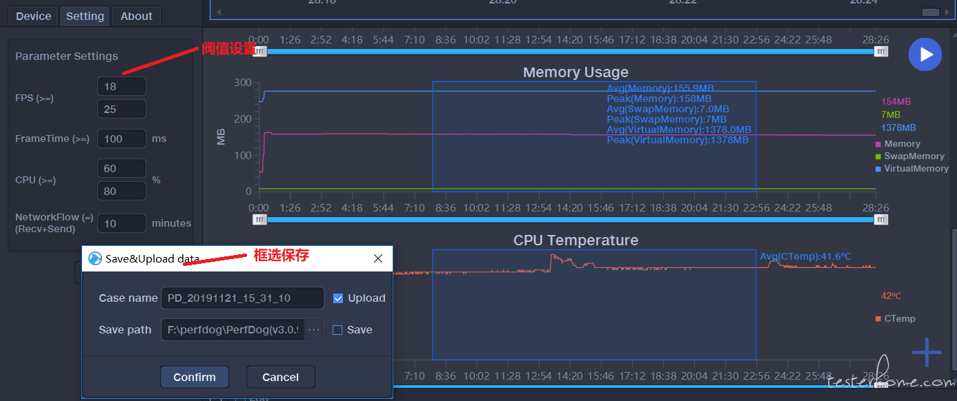 当我在监控和记录了一定的数据之后,通过 Record 按钮可以保存到本地或者直接上传到 PerfDog 的云端服务器,这个记录保存和上传过程可随时进行。